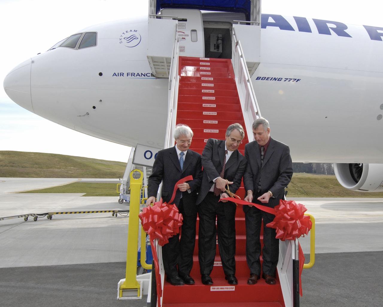 Boeing's Aldo Basile (left) and Larry Loftis flank Air France's Pierre Vellay as he cuts the ribbon and takes delivery of the first Boeing 777F in 2009.