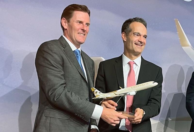 AerCap’s Peter Anderson (left) and Etihad CEO Antonoaldo Neves hold a model of the carrier's A321LR at the delivery ceremony.
